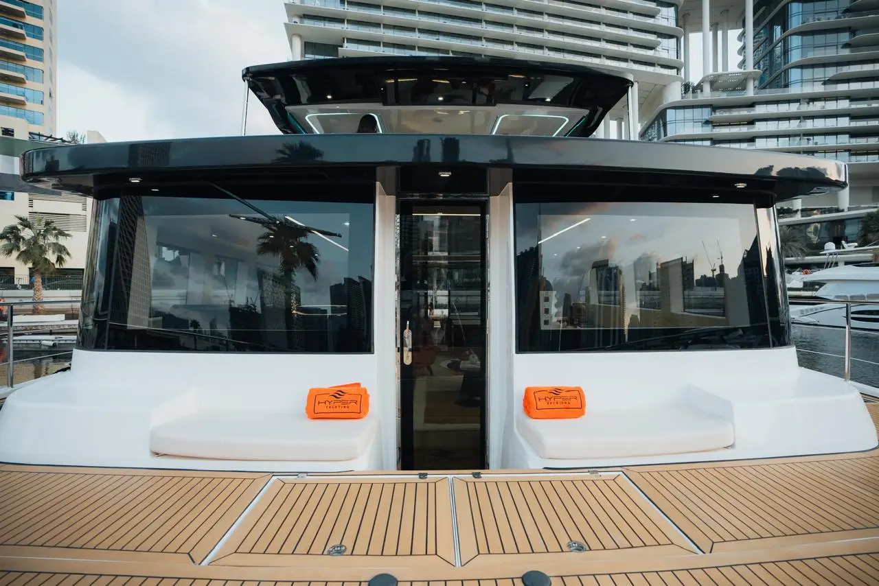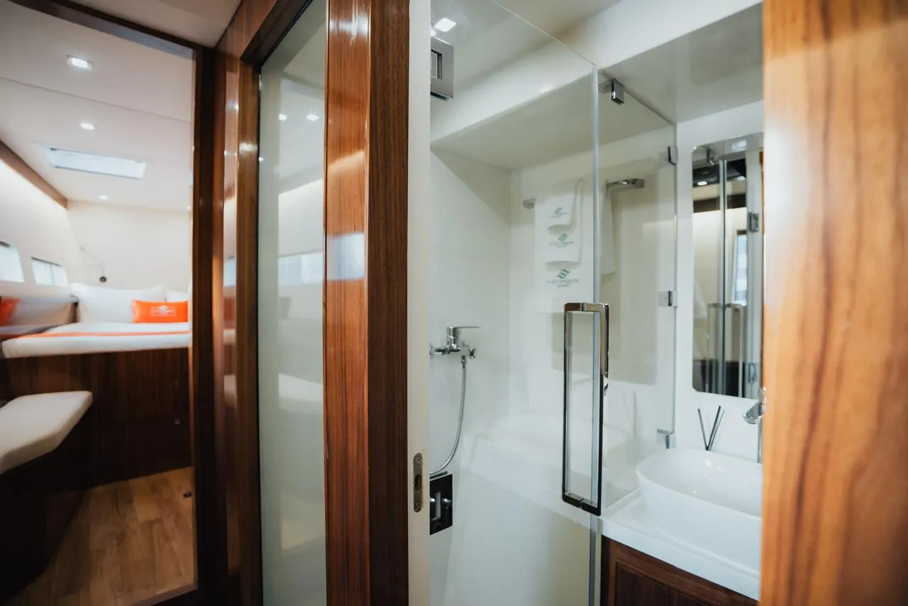 The Catamaran 55, also known as Hyper One, redefines luxury sailing with her innovative twin-hull design. This 17-meter vessel offers unmatched stability and expansive deck space, perfect for families and groups who want to maximize comfort and minimize seasickness. Her wide beam creates generous indoor and outdoor living areas, while her shallow draft allows access to secluded anchorages unreachable by traditional yachts. Whether you're hosting sunset cocktails on her vast aft deck or enjoying al fresco dining with 360-degree views, Hyper One's catamaran design ensures everyone has room to breathe, relax, and connect with the ocean in spacious luxury.